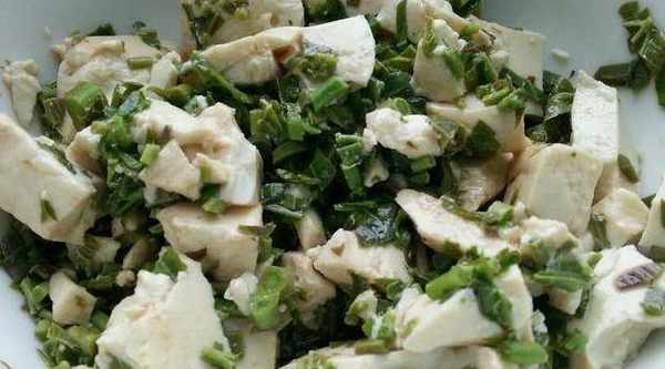 2、豆腐切小方块,与碎香椿一起放入碗中;