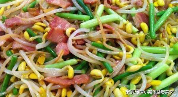 3、炒锅烧热,倒入油。油40%热时,加入蒜片炒香,再加入培根片炒出油,倒入黄豆芽翻炒2分钟。