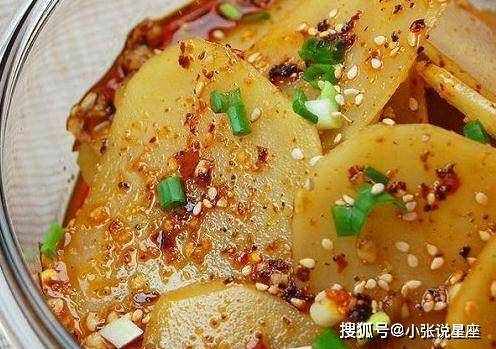 4、捞出煮好的土豆片,立即放入冰水中浸泡冷却,然后捞出沥干,用佐料拌匀,装盘,撒上葱花和白芝麻即可