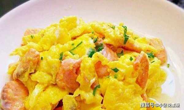 3、然后把鸡蛋加进去,不要搅动,能翻锅最好,翻几下就可以,等鸡蛋稍微凝固就要出锅,要不就老了,装盘撒点儿葱花就可以了。