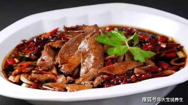 3.锅中放入烧好的辣椒油,加热至70%热。干辣椒粒和干青花椒炒香后,出锅浇在锅里的肝片上。使用高油温将它们煮熟。最后撒上葱花即可上桌。桌子。