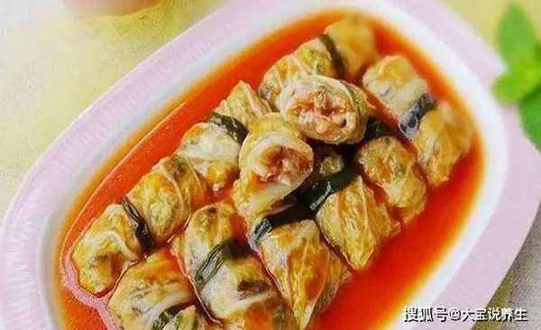 3、小白菜叶和韭菜洗净,放入开水锅中烫软,取出凉水浸泡,取小白菜叶一片,放上肉馅,包好,扎好。配韭菜叶,包装袋上好的蔬菜用蒸锅蒸15分钟