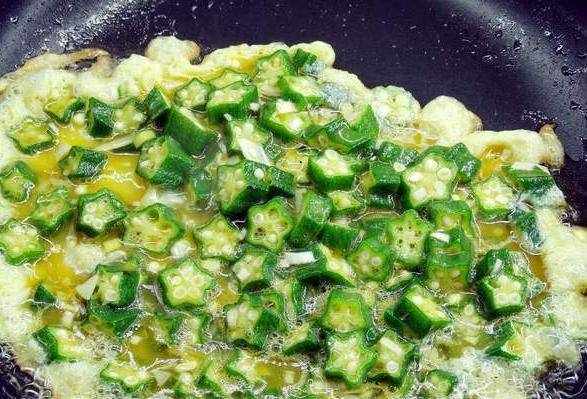 6.在另一个锅中加热油。油烧开后,加入葱花翻炒出香味。然后倒入秋葵边不断搅拌边炒匀。继续撒上适量的盐,淋在切碎的鸡蛋上,炒好后关火上桌。.