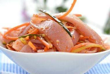 2、肉切丝,用少许料酒和盐腌去腥味。