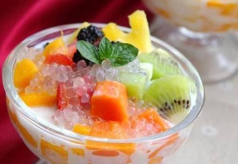 原料:椰浆250克,椰汁200克,白糖40克,西米足量,芒果半个,木瓜半个,菠萝半个,草莓十个,桑葚一盒,猕猴桃两颗。(你可以加任何你喜欢的水果)