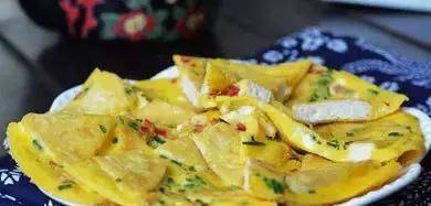 3、倒入蛋液,待底层凝固后翻面;从锅中取出后,切成小块。