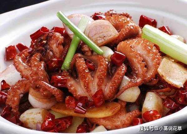 材料:章鱼、盐、辣椒粉、孜然粉、料酒、蒸鱼酱油、干辣椒、油、葱、姜、蒜、香菜