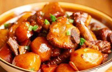 3、炒锅倒入油烧热,放入切好的姜蒜片翻炒,将猪肉揉搓均匀;加入料酒、糖、酱油、蚝油、葱、蒜、胡椒粉、八角,搅拌均匀;4、加水,大火煮熟,转小火煮50分钟至排骨软熟;加入土豆、蘑菇和胡萝卜,加盐调味,继续煮10分钟左右,直到土豆变软,胡萝卜变软熟透;