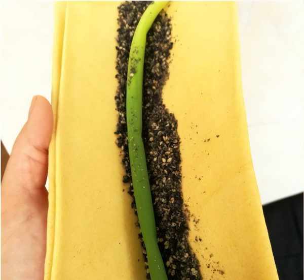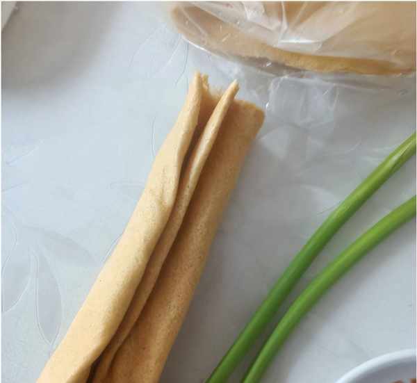 这位山东同事一个人在家,老婆去给儿子带孩子去了,平时都是简单对付,嘴馋了就下个馆子,小日子过得还不错,今天在家就是吃山东煎饼,不过没有什么大葱小葱,就用几根蒜薹代替,因为蒜薹的保存时间比葱要长一点,所以大哥没事就买一点放在家里,方便卷着煎饼充饥,这个煎饼也是他在外面买的,每次都要买好几袋,又便宜又好吃,非常方便。