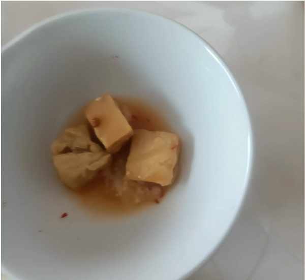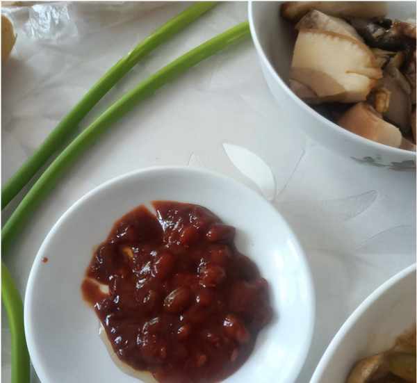 另外就是腐乳和酱豆,腐乳是外面买的现货,蘸着蒜薹就够味了,酱豆是老婆在家亲自做的,做了好几大罐,够大哥吃半年,每次取一点,不说为了填饱肚子,但是吃饭时总少不了来几口。虽然只有一个热菜,但是这顿饭绝对不含糊,不是什么招待客人的好菜,但绝对是山东老百姓餐桌上的家常菜,本来就是凑巧碰到饭点,所以也来不及做什么新鲜的肉菜了,河南小伙子也不在意,赶紧卷好一个就吃了起来。