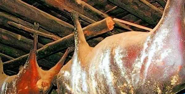 如果想要存放更久的时间,人们会把猪在干燥的麦糠中吸水,湿掉的麦糠皮就会换掉,然后再换成干燥的麦糠皮,整个的过程要持续将近半个月,整猪的外表变得非常干燥。如果要存放很长时间,只是把猪肚子密封起来发酵明显不够。