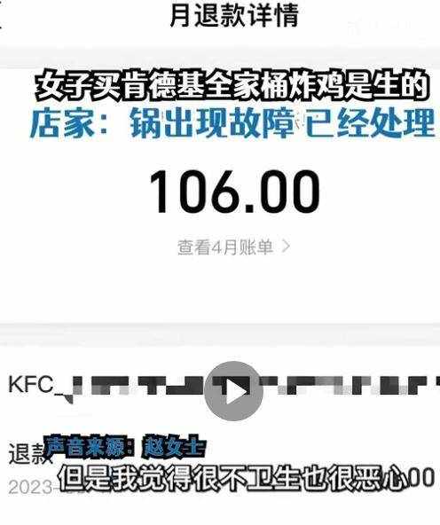 据了解,赵女士在肯德基花费106元购买全家桶后,发现其中的炸鸡腿里面是生的。当时,她立即联系了店家,并提出要求退款或者重新制作一份全家桶。虽然店家态度还算友好,但由于她觉得不卫生,最终的解决方式是店家退款并送了两杯可乐。赵女士表示,希望能够加强管理食品操作流程。在这起事件中,肯德基华阳城店的工作人员称,锅出现故障,烹炸时间还没到,现在已经修好了。这份声明应该得到大多数人的认可,因为人们应该相信店家会采取必要的措施来确保食品的安全和质量。毕竟,顾客的健康和口感是店家持续发展的重要因素。