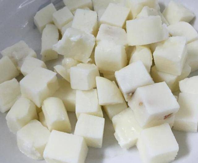 第六步:锅中倒入少许食用油。煮熟后,加入牛奶块,用中小火慢慢煎至金黄色,取出过油即可食用。
