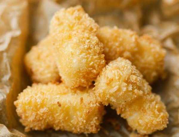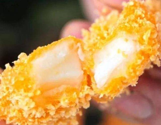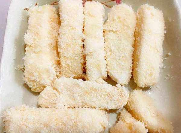 第五步:将切好的牛奶块放入蛋液中均匀的裹上面团层,然后继续用面包屑裹上面包屑层。