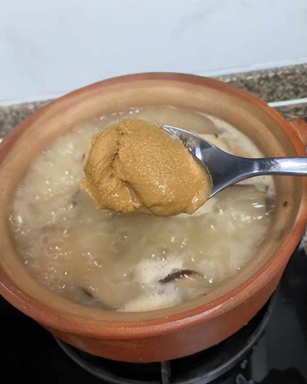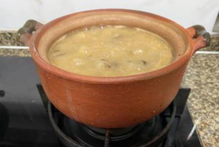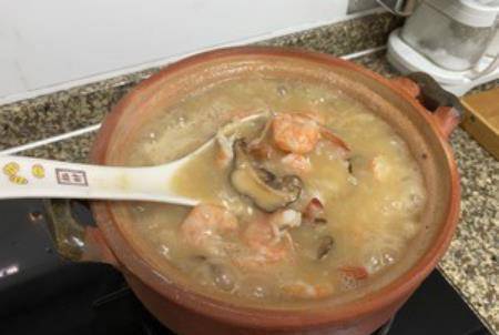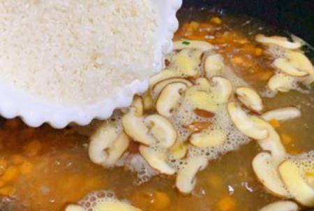 7.大米熬成粥后放入冬菜和煎香的香菇片继续小火慢熬