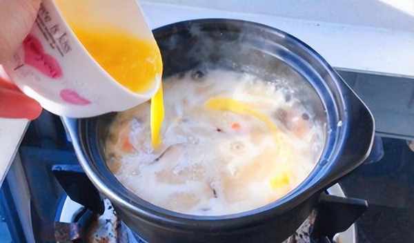 5.加入鸡蛋液,搅拌均匀,煮沸腾即可出锅