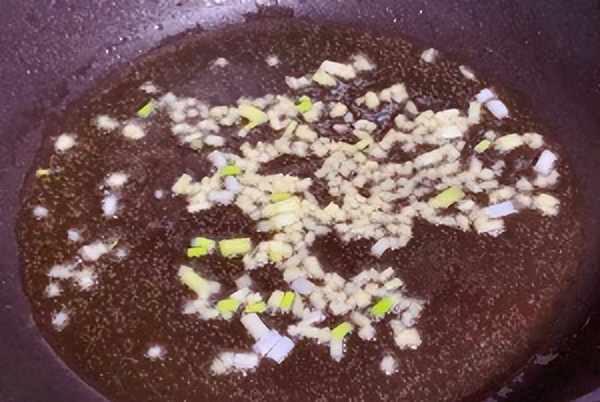 3.加适量盐抓匀腌制十分钟,锅中加油,下蒜白姜末炒香