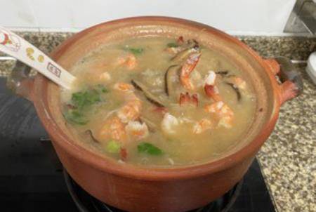 用料:虾400g,大米1杯,冬菜30克,干香菇适量,干贝10粒,花生酱1勺,香菜适量,盐适量,白胡椒粉适量