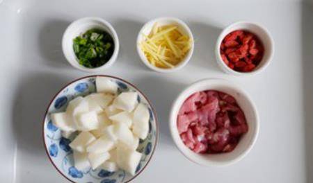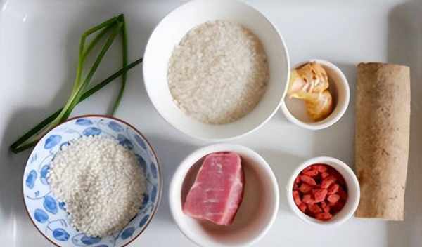 用料:大米100g,糯米50g,瘦肉100g,山药150g,生姜5g,枸杞5g,饮用水800ml,小葱适量,生粉适量,盐适量,白胡椒粉适量,香油适量