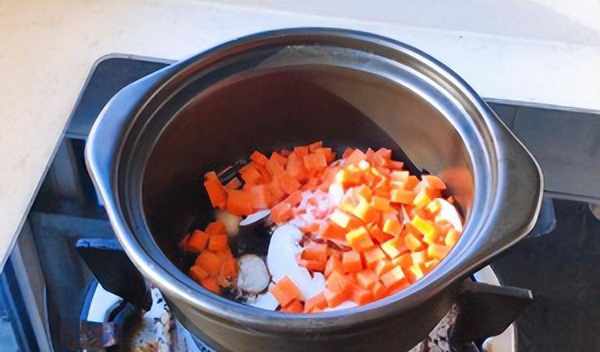 5.砂锅中放入油,加入香菇片和胡萝卜块,炒至断生;