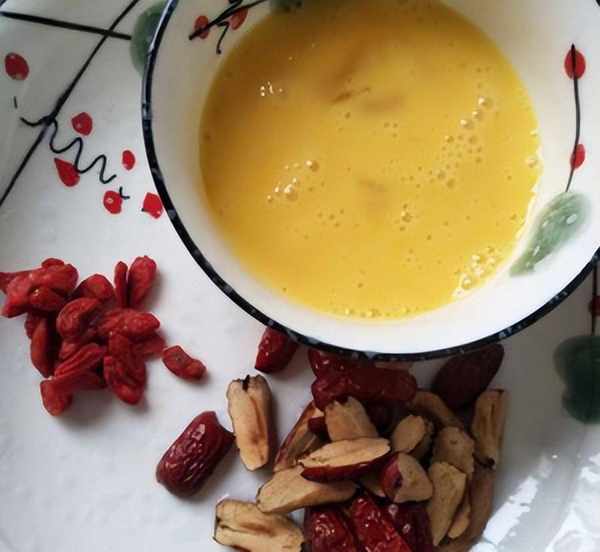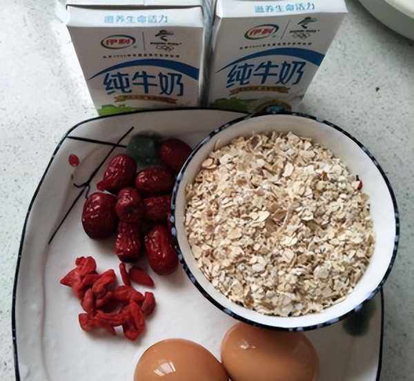 用料:即食燕麦片80克,纯牛奶500ml,鸡蛋2个,红枣10颗,枸杞15粒