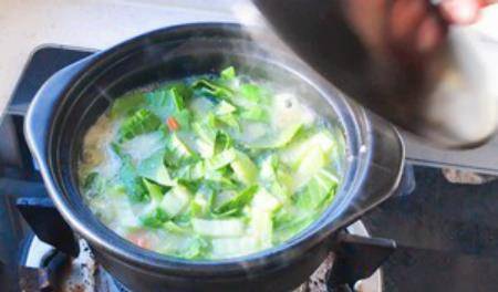 6.蔬菜类煮熟后加入青菜和虾仁,放入适量盐