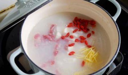 5.再加入瘦肉、生姜丝和枸杞再煮10分钟。