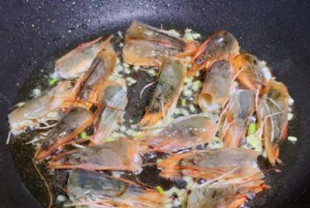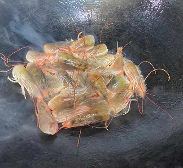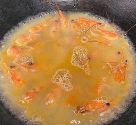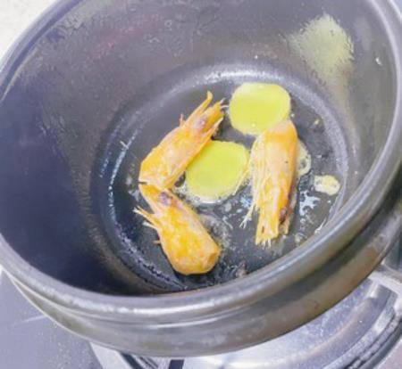 4.放入虾头煎出虾油,盛出虾头和葱姜