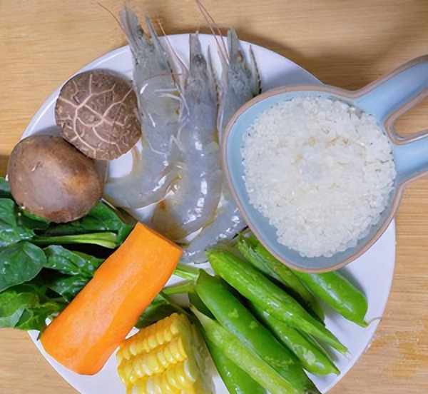 用料:鲜虾20只,青豆1把,玉米1根,胡萝卜半根,香菇6朵,青菜适量,姜适量,香葱1根,大米适量