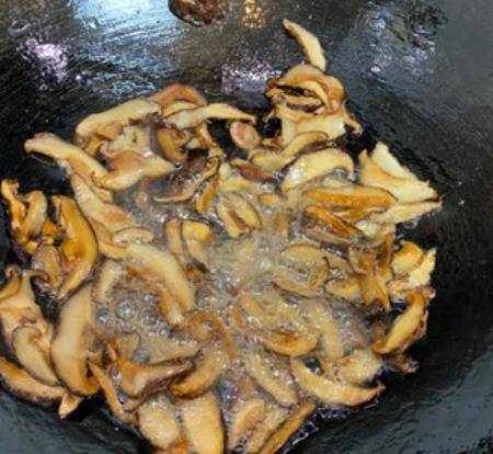 2.锅内倒入少许油,放入香菇薄片,小火煎香捞出备用
