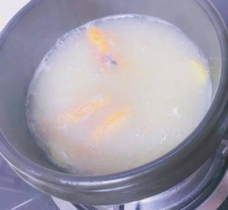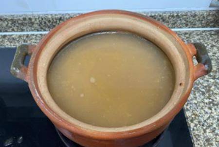 6.把虾汁倒入砂锅内,放入浸泡好的大米和瑶柱大火煮开,然后转小火慢熬