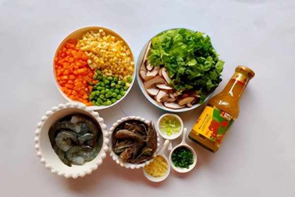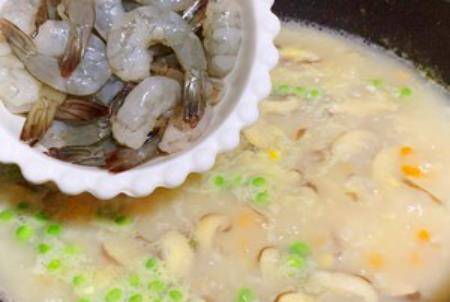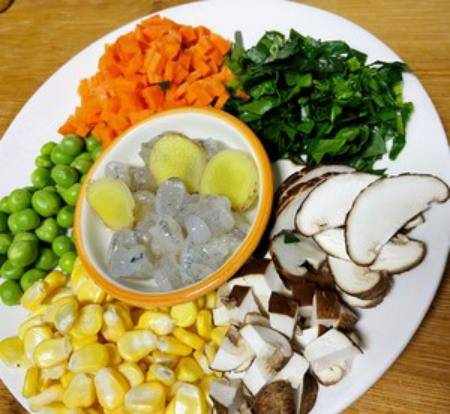 用料:虾3只,胡萝卜适量,香菇2朵,大米适量,菠菜1颗,豌豆适量,玉米适量,姜适量