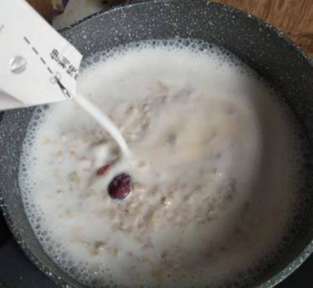 4.加入燕麦片,倒入纯牛奶,小火煮开。