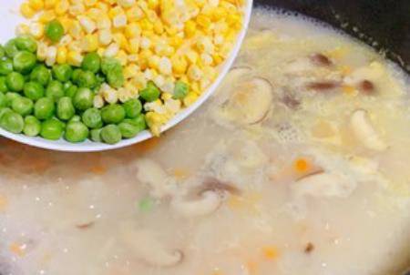 5.大米煮黏糊了依次加入香菇、胡萝卜丁、玉米粒和豌豆