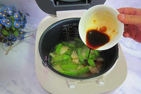 3,菜倒入电饭煲内,加上调好的酱油蚝油,不需要另行加水。