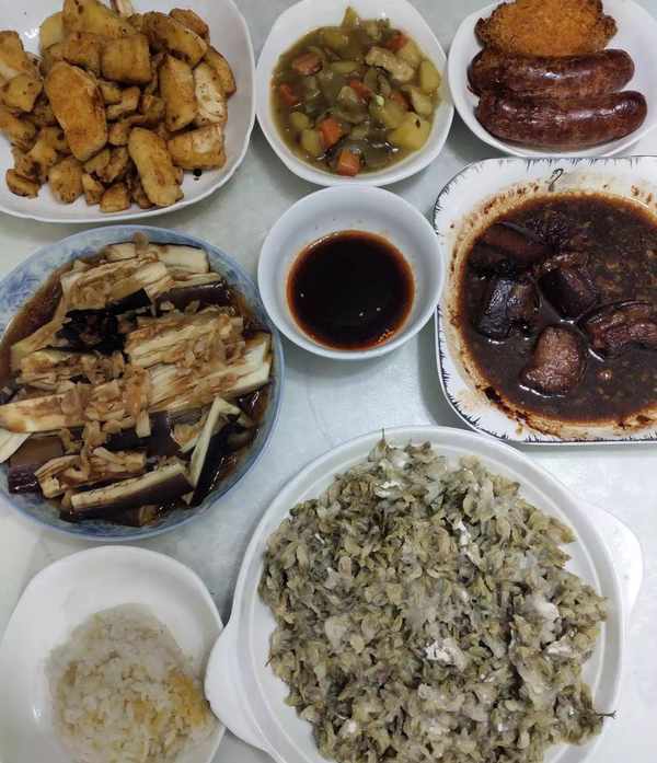 整体效果图!剩下的红烧肉 烤肠 烤鸡排!