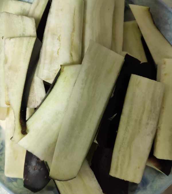 蒸茄子 ,粉丝泡软时尚,茄子切长条盖在粉丝上。