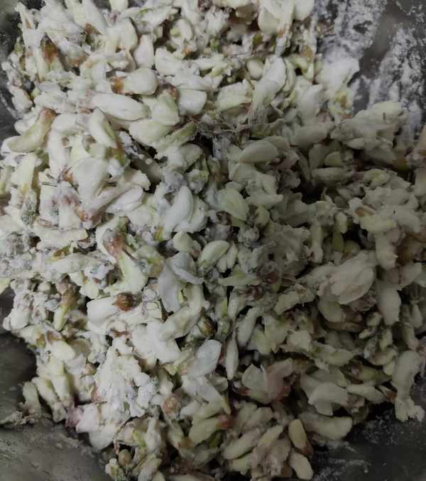 蒸槐花,做法非常简单,槐花加盐、面粉水少许搅匀。