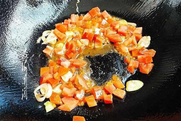 炒锅少许加点油,爆香五香粉和葱花,下入西红柿丁翻炒,炒至西红柿出汤汁。