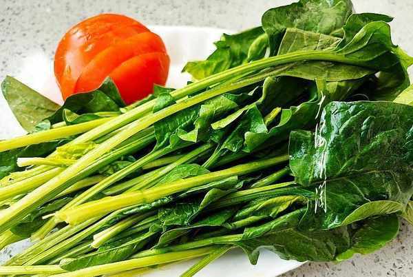 西红柿、菠菜分别在淡盐水中浸泡10分钟左右,然后用清水反复冲洗干净。