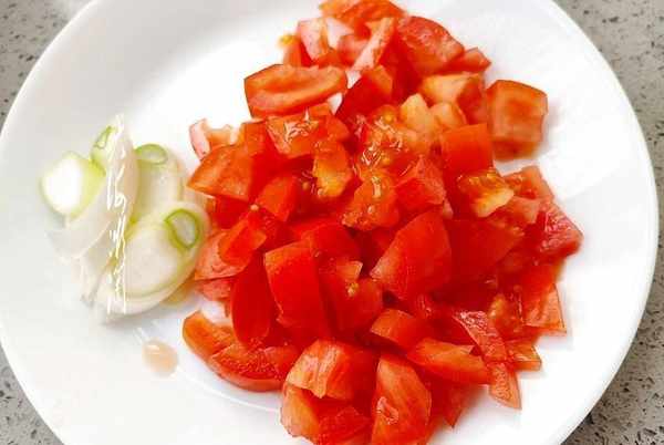西红柿切丁,西红柿也可以开水烫一下去皮再切丁,不烫也可以,随个人喜好。葱去皮洗净,切葱花。
