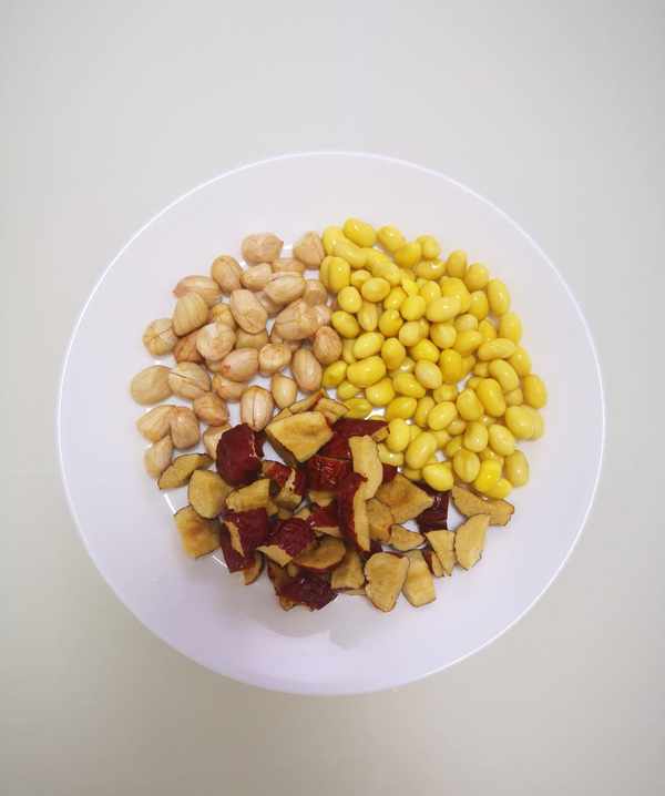 黄豆、花生洗净后用凉水泡一夜,红枣去核切成小块。