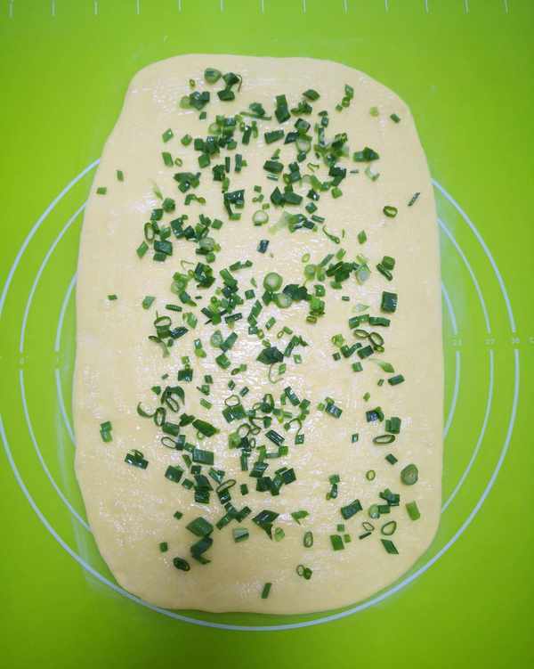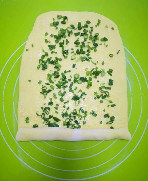 取出发酵好的面团,反复揉面至面团光滑,擀成约一元硬币厚的长方形薄面片,刷上薄薄一层稀油酥、撒点葱花,油酥里面我已经加盐了,增加点咸香味。