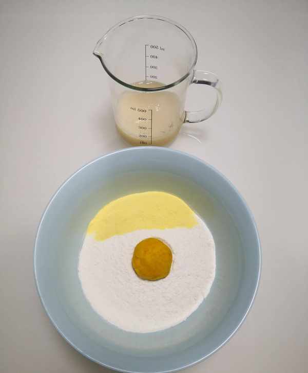 南瓜蒸熟后趁热压成泥,晾凉至不超过40度,碗中加晾凉后的南瓜泥、玉米面粉、中筋面粉,比例为1:1:5,酵母放温水里化开。