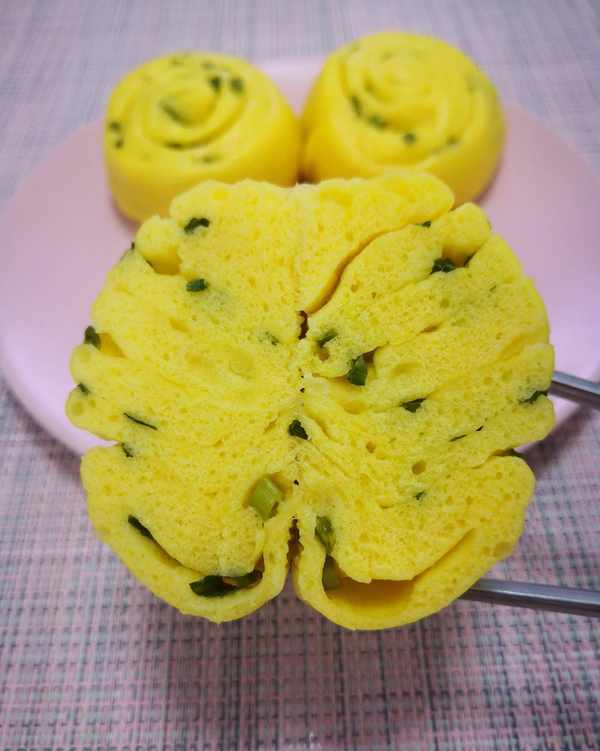 南瓜泥、玉米面粉、中筋小麦面粉、酵母、温水、剩的稀油酥、葱花。