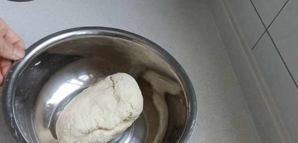 一.还是先和面,首先盆中倒入500克普通面粉,加入260克温水,边倒边搅拌,搅拌成棉絮状,用手揉成稍软的面团。盖上盖醒发半小时。