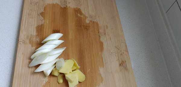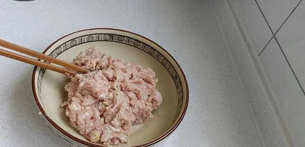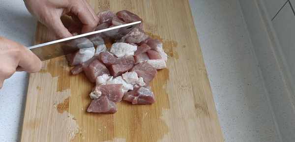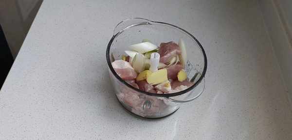 二.接下来,开始准备馅料,准备一块三肥七瘦的猪肉,用刀切成小块。再把葱姜切块,放入绞肉机里,搅碎之后放入大碗中。