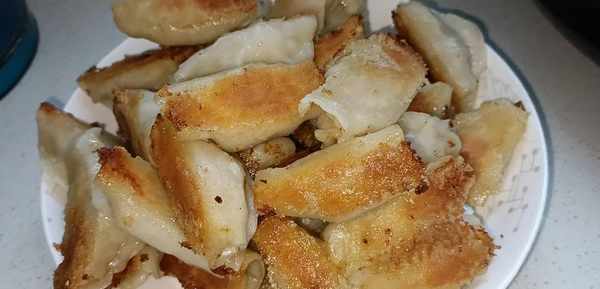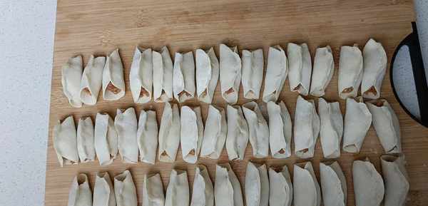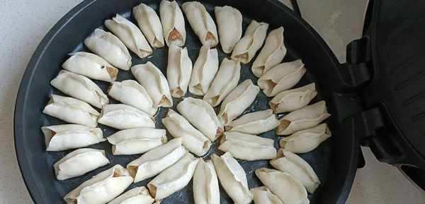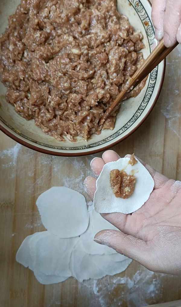 五.开始包了,取一个水饺皮,把调好的馅料放到水饺皮中间,用手只捏紧中间,两边留出小口,这样一个锅盔生胚就做好了。