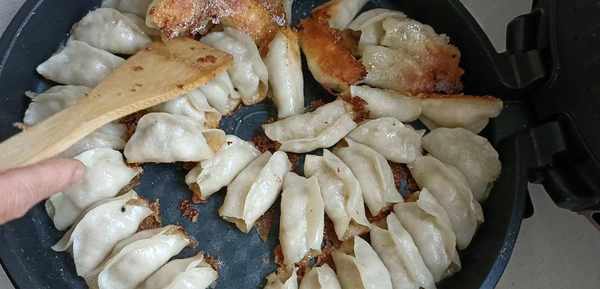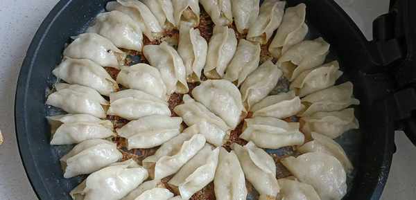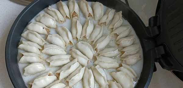 六.全部包好之后,电饼铛提前预热,倒入适量食用油,把包好锅盔生胚放入锅中,煎到底部微微发黄,再倒入适量淀粉水,没过锅盔生胚的三分之二就可以了,盖上盖子煎15分钟,把淀粉水靠干,一道外皮酥脆,肉质鲜美的锅盔就做好了。