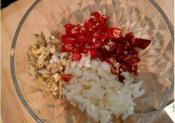 第二步:准备配料: 小块的去皮生姜,切成姜末;三四粒大蒜,切成蒜末;一点小米椒,切成小段(不喜欢辣可不放)待用。